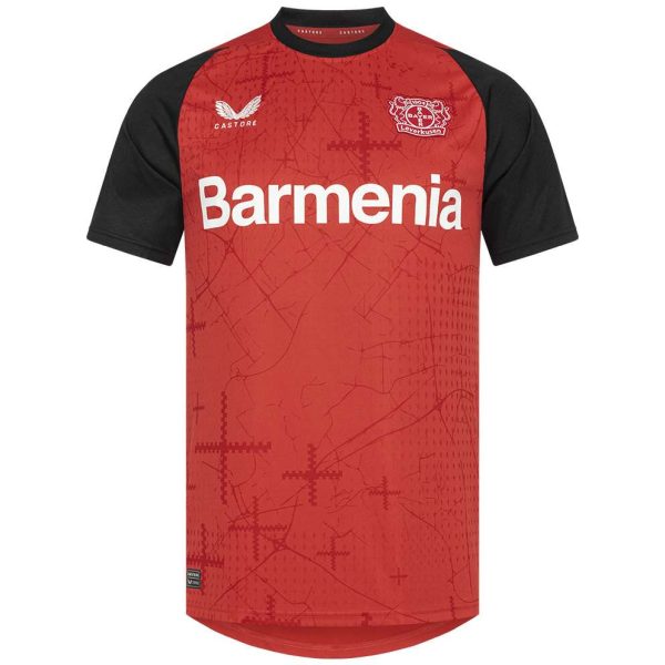Die Highlights sind das in kupfer gefärbte Bayer 04 Logo auf der linken Brust, das in kupfer gefärbte und gestickte Ausrüster-Logo der britischen Premium-Marke Castore auf der rechten Brust sowie die optional auswählbare Rückenbeflockung in einem glänzenden Kupfer-Ton. Der Nacken wird durch einen kupferfarbenden „Werkself“-Schriftzug geziert. Auf der Brust ist der Hauptsponsor Barmenia in schwarzer Schrift abgebildet.