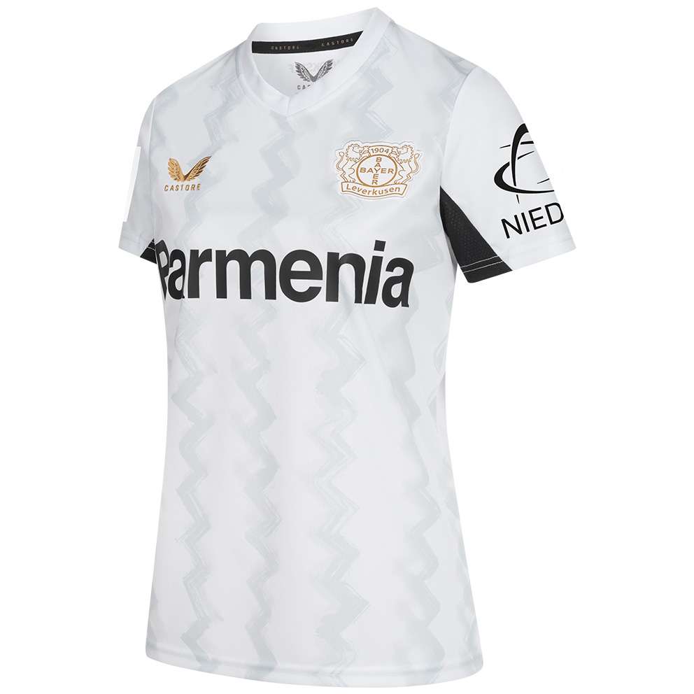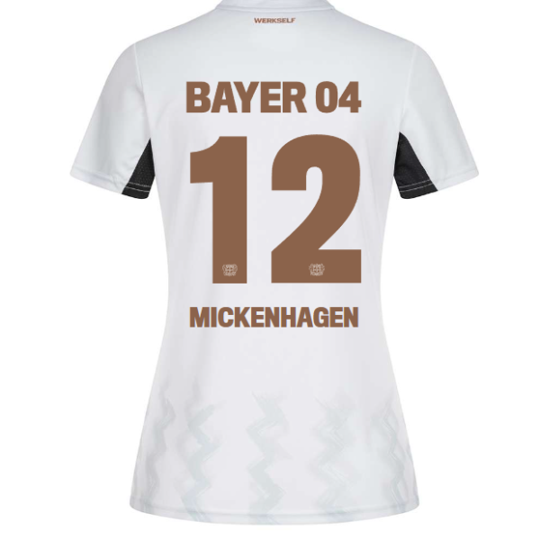 – Ein Auswärtstrikot mit einem Flock der Bayer 04-Frauen wird nicht mit dem goldenen Meisterbadge und dem Partnerbadge „Niedax“ veredelt, sondern mit den Partnern der Bayer 04-Frauen. Die Ärmel werden mit dem Logo der Frauen-Bundesliga und dem Ärmelpartner „S2“ veredelt. Auf dem Rücken, unterhalb der Rückennummer, wird der Partner „früh“ bedruckt.