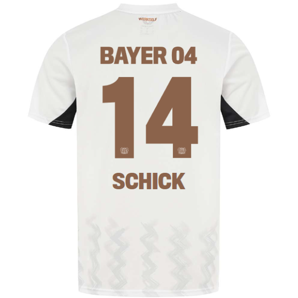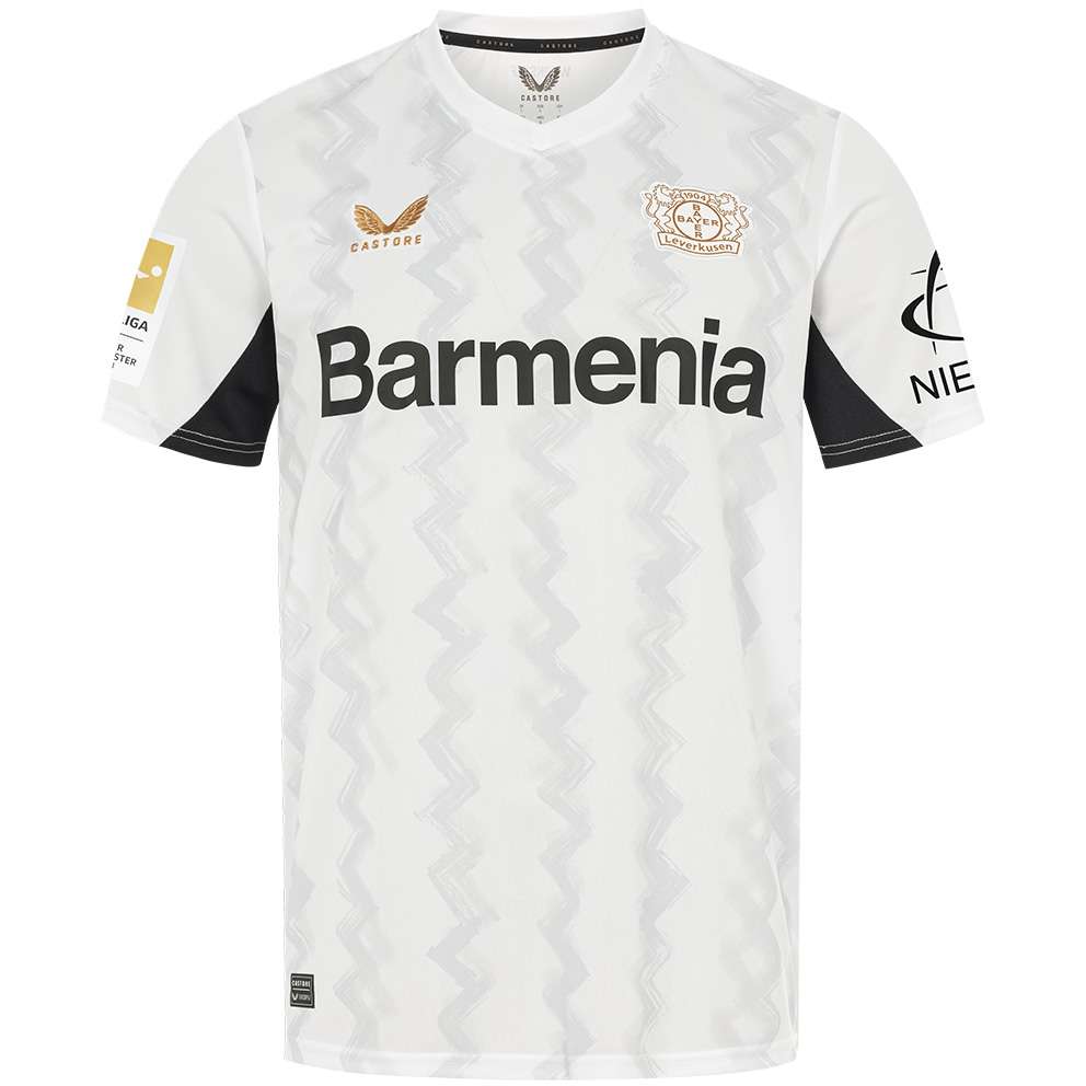 Das weiße Auswärtstrikot von Bayer 04 wird von gräulichen Streifen geziert, die sich in einem Zickzack-Muster von oben nach unten über das Trikot ziehen.