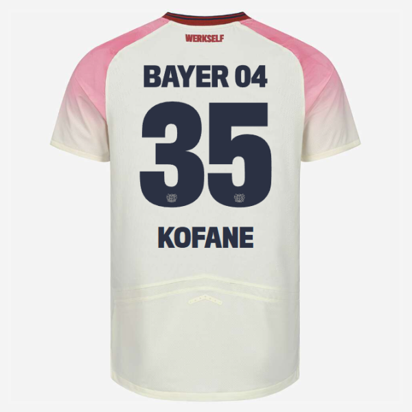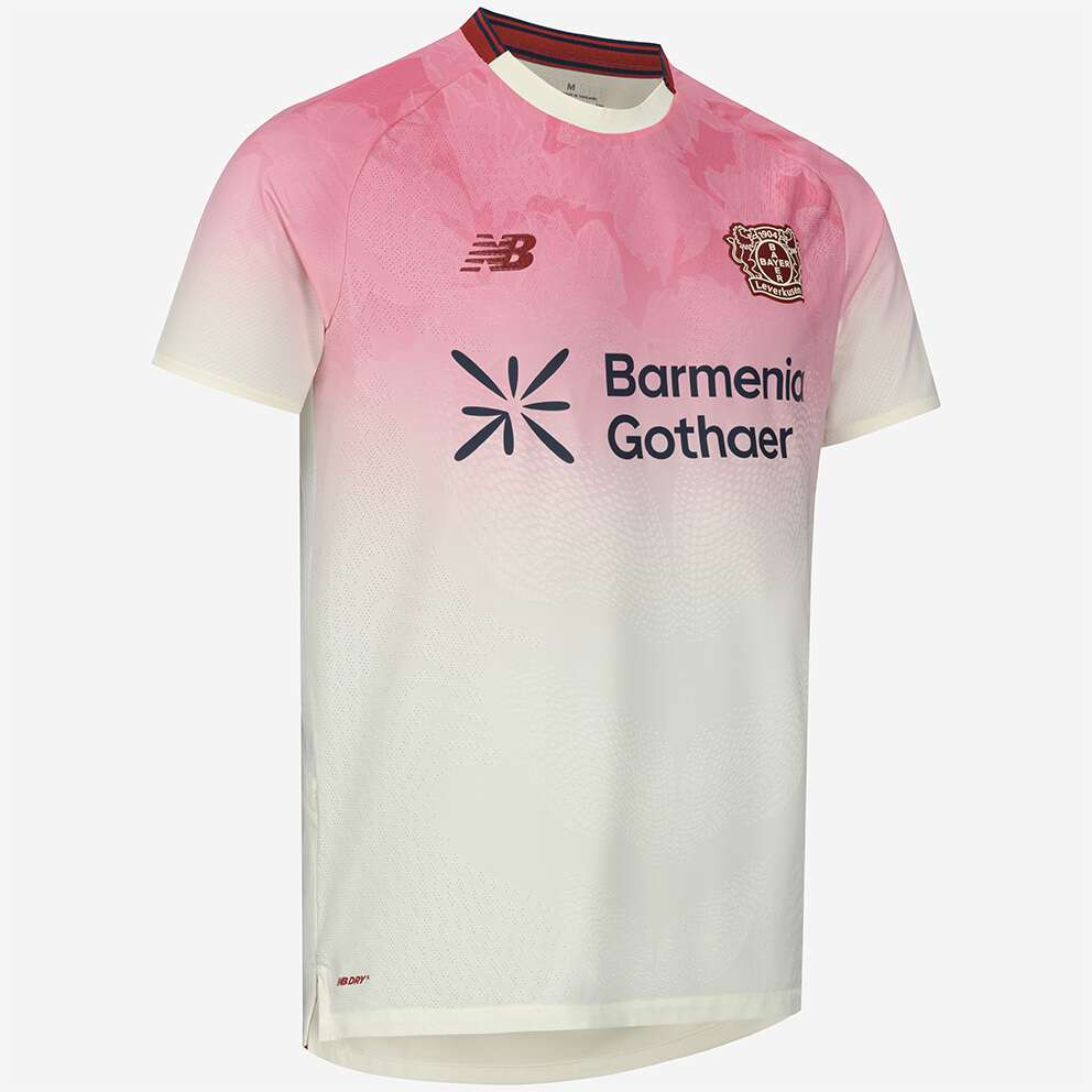 Das Bayer 04-Logo sowie das Logo unseres neuen Ausrüsters New Balance stechen in einer purpurrot bedruckten Optik auf der Brust heraus, während unser Brustsponsor BarmeniaGothaer in dunkelblauer Schrift hervortritt. Der Nacken wird durch einen roten „Werkself“-Schriftzug geziert, der die Verbundenheit zur Mannschaft unterstreicht.