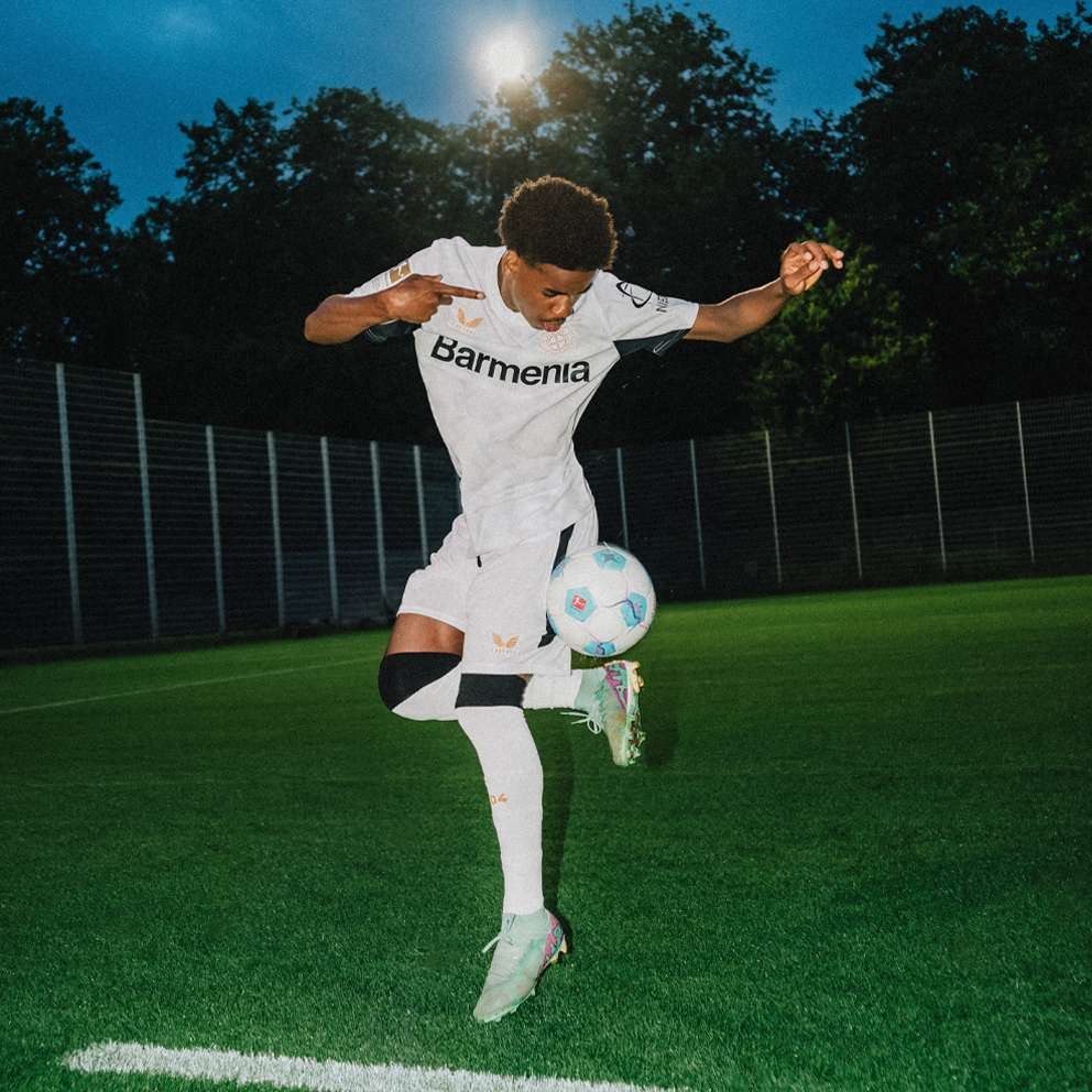 Aufbruch unterm Kreuz. Immer dabei. Ob nah oder weit. Das Auswärtstrikot der Werkself.