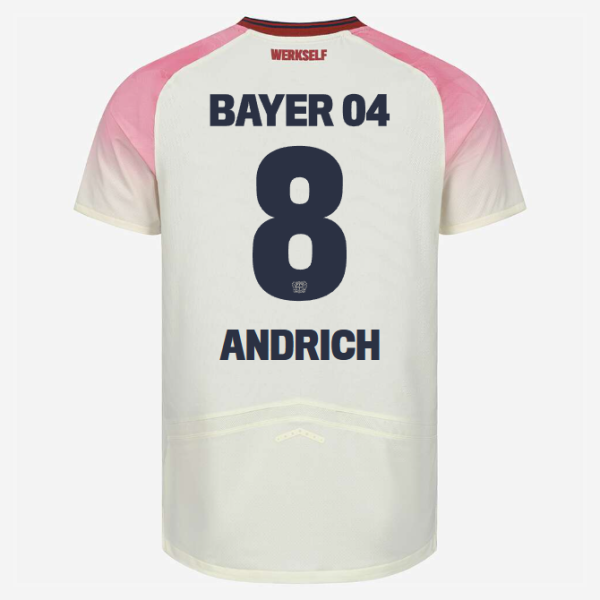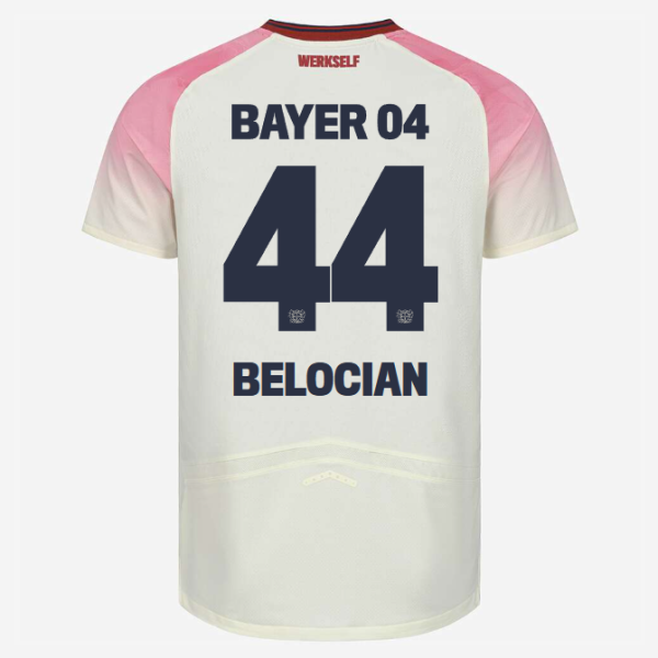 Das Bayer 04-Logo sowie das Logo unseres neuen Ausrüsters New Balance stechen in einer purpurrot bedruckten Optik auf der Brust heraus, während unser Brustsponsor BarmeniaGothaer in dunkelblauer Schrift hervortritt. Der Nacken wird durch einen roten „Werkself“-Schriftzug geziert, der die Verbundenheit zur Mannschaft unterstreicht.