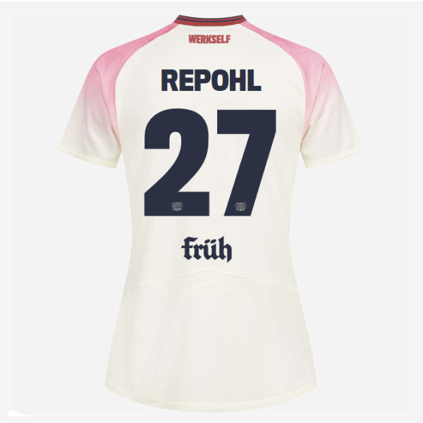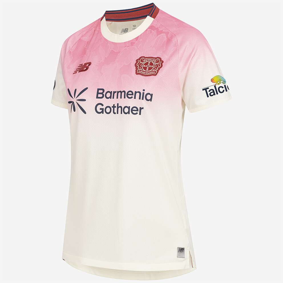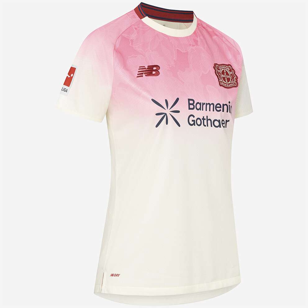 Das Trikot besticht durch eine auffällige Farbgestaltung aus Purpurrot und Cremeweiß. Die purpurrote Farbe verläuft elegant von der Schulter bis zur Brust und vereint sich harmonisch mit dem sanften Cremeweiß unterhalb der Brust. Die sanfteren Farbtöne sowie eine florale Schattengrafik sind eine Anspielung auf den Japanischen Garten in Leverkusen.