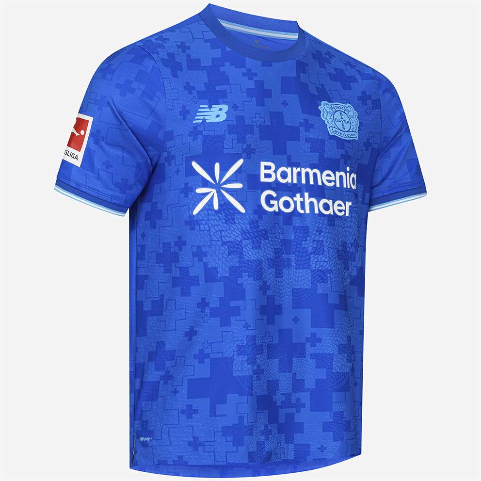 Das Bayer 04-Logo sowie das Logo unseres neuen Ausrüsters New Balance stechen in einer cyan gestickten Optik auf der Brust heraus, während unser Brustsponsor BarmeniaGothaer in weißer Schrift hervortritt. Der Nacken wird durch einen cyan gefärbten „Werkself“-Schriftzug geziert, der die Verbundenheit zur Mannschaft unterstreicht.