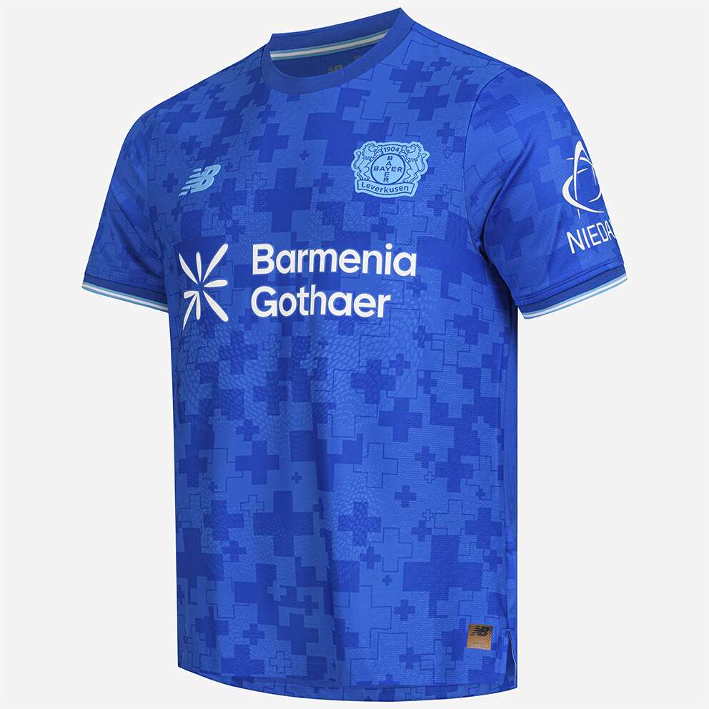 Das Design des Ausweichtrikots 25/26 spiegelt in einem ausdrucksstarken Blau und Cyan die Identität Leverkusens, der„Farbenstadt“, auf stilvolle Weise wider. Im Mittelpunkt steht der vollflächige Grafikdruck aus sich überlappenden Kreuzen, der eine moderne Interpretation des ikonischen Bayer-Kreuzes bildet. Dieses Design vereint die über 120-jährige Geschichte des Klubs und der Stadt mit einem mutigen, zeitgemäßen Look.