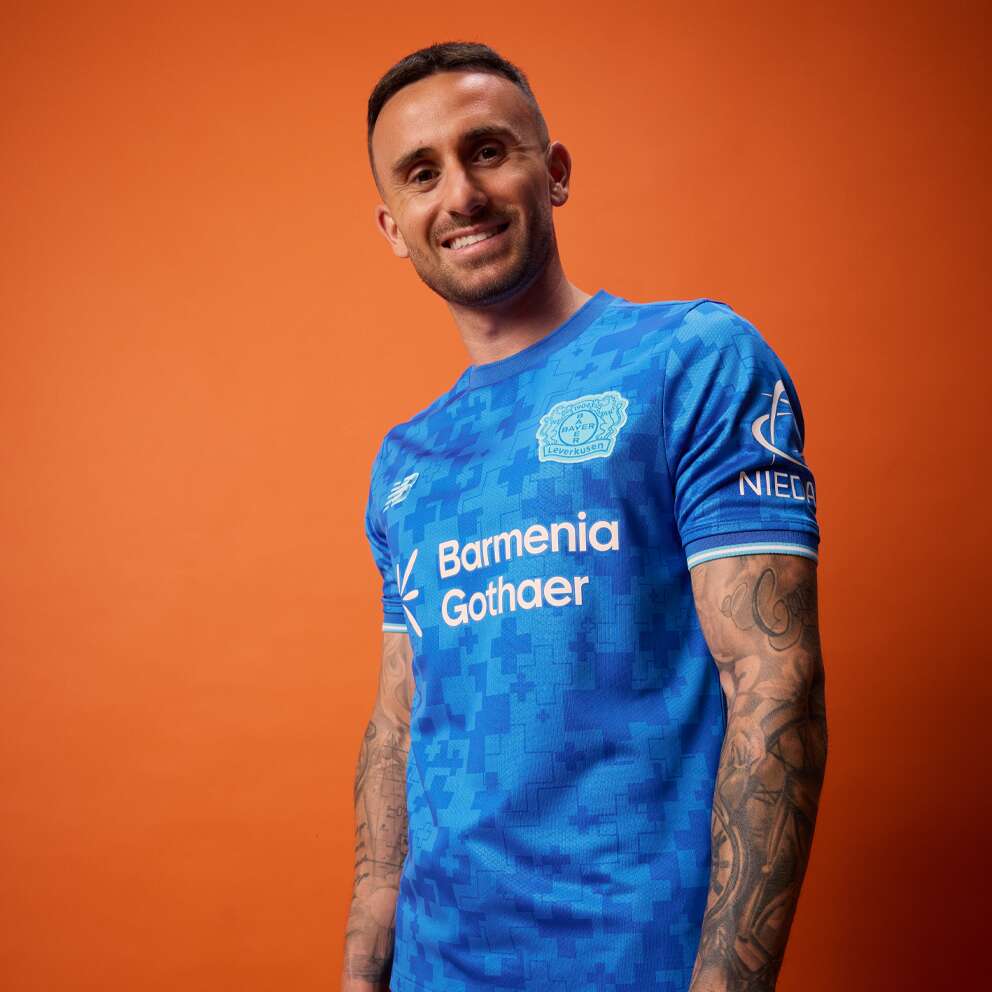 Das Bayer 04-Logo sowie das Logo unseres neuen Ausrüsters New Balance stechen in einer cyan gestickten Optik auf der Brust heraus, während unser Brustsponsor BarmeniaGothaer in weißer Schrift hervortritt. Der Nacken wird durch einen cyan gefärbten „Werkself“-Schriftzug geziert, der die Verbundenheit zur Mannschaft unterstreicht.