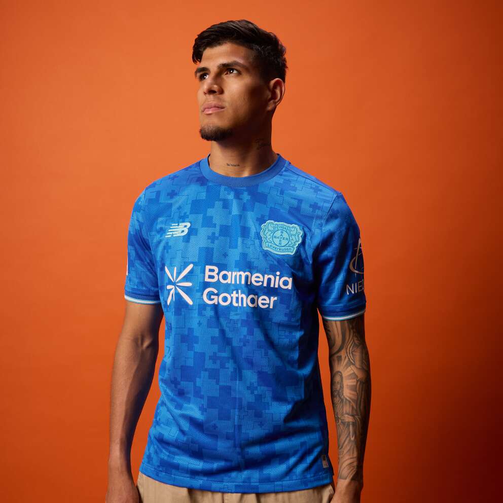 Das Bayer 04-Logo sowie das Logo unseres neuen Ausrüsters New Balance stechen in einer cyan gestickten Optik auf der Brust heraus, während unser Brustsponsor BarmeniaGothaer in weißer Schrift hervortritt. Der Nacken wird durch einen cyan gefärbten „Werkself“-Schriftzug geziert, der die Verbundenheit zur Mannschaft unterstreicht.