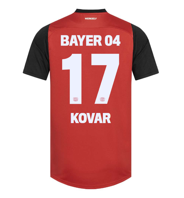Das neue schwarz-rote Heimtrikot ist da und wird erstmals seit 120 Jahren mit dem goldenen Badge des deutschen Fußball-Meisters auf dem rechten Ärmel geprägt. Das Trikot wird von vielen verschiedenen Elementen der Stadt geziert: die Diamanten des Wasserturms, einem aus den Zacken des Stadtwappens zusammengesetzten Kreuz und die Stadtkarte von Leverkusen.