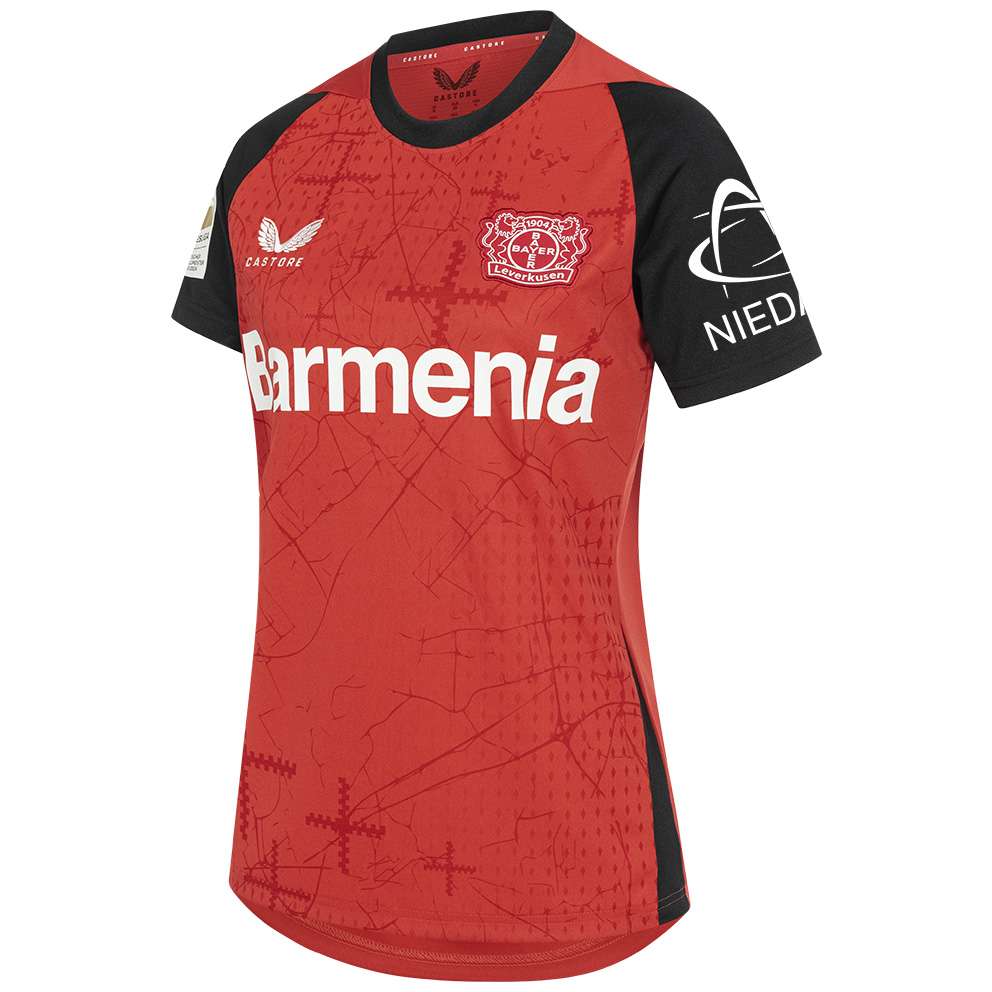 Das neue schwarz-rote Heimtrikot ist da und wird erstmals seit 120 Jahren mit dem goldenen Badge des deutschen Fußball-Meisters auf dem rechten Ärmel geprägt. Das Trikot wird von vielen verschiedenen Elementen der Stadt geziert: die Diamanten des Wasserturms, einem aus den Zacken des Stadtwappens zusammengesetzten Kreuz und die Stadtkarte von Leverkusen.