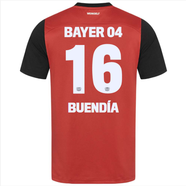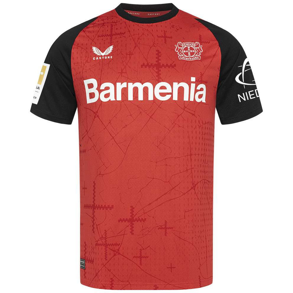 Das neue schwarz-rote Heimtrikot ist da und wird erstmals seit 120 Jahren mit dem goldenen Badge des deutschen Fußball-Meisters auf dem rechten Ärmel geprägt. Das Trikot wird von vielen verschiedenen Elementen der Stadt geziert: die Diamanten des Wasserturms, einem aus den Zacken des Stadtwappens zusammengesetzten Kreuz und die Stadtkarte von Leverkusen.