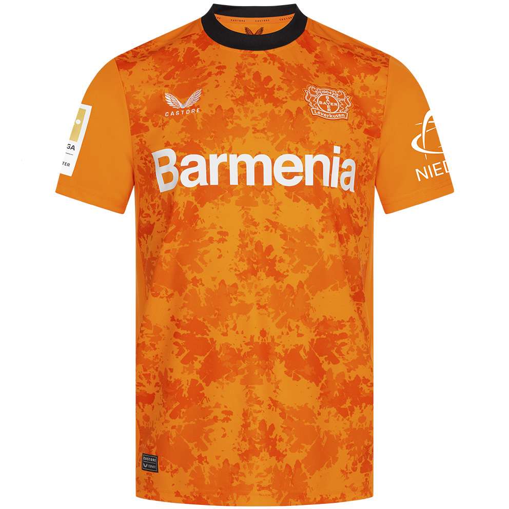 Das Trikot hat einen geraden Unisex-Schnitt und erweist sich so als das Must-have für deinen Stadionbesuch. Das Bayer 04-Logo passt sich dem Trikot in einer orange-weiß gestickten Optik auf der linken Brust an, auf der rechten Brust befindet sich das in weiß gefärbte und gestickte Ausrüster-Logo der britischen Premium-Marke Castore. Der Nacken wird durch einen weißen „Werkself“-Schriftzug geziert. Auf der Brust ist der Hauptsponsor Barmenia in weißer Schrift abgebildet.