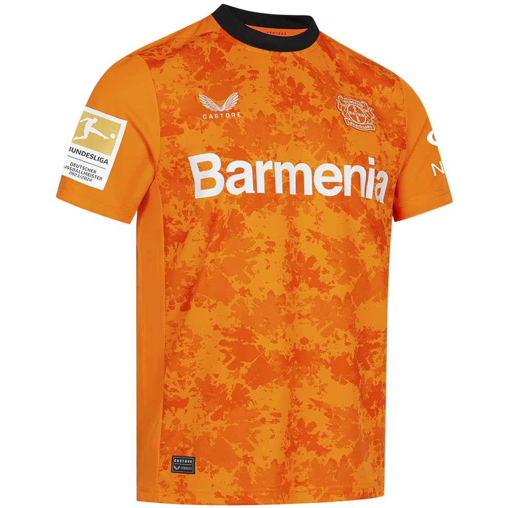 Das Trikot hat einen geraden Unisex-Schnitt und erweist sich so als das Must-have für deinen Stadionbesuch. Das Bayer 04-Logo passt sich dem Trikot in einer orange-weiß gestickten Optik auf der linken Brust an, auf der rechten Brust befindet sich das in weiß gefärbte und gestickte Ausrüster-Logo der britischen Premium-Marke Castore. Der Nacken wird durch einen weißen „Werkself“-Schriftzug geziert. Auf der Brust ist der Hauptsponsor Barmenia in weißer Schrift abgebildet.