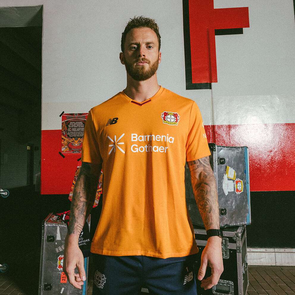 Das Bayer 04-Logo sowie das Logo unseres neuen Ausrüsters New Balance stechen in einer gestickten Optik auf der Brust heraus, während unser Brustsponsor BarmeniaGothaer in weißer Schrift hervortritt. Der Nacken wird durch einen schwarzen „Werkself“-Schriftzug geziert, der die Verbundenheit zur Mannschaft unterstreicht.